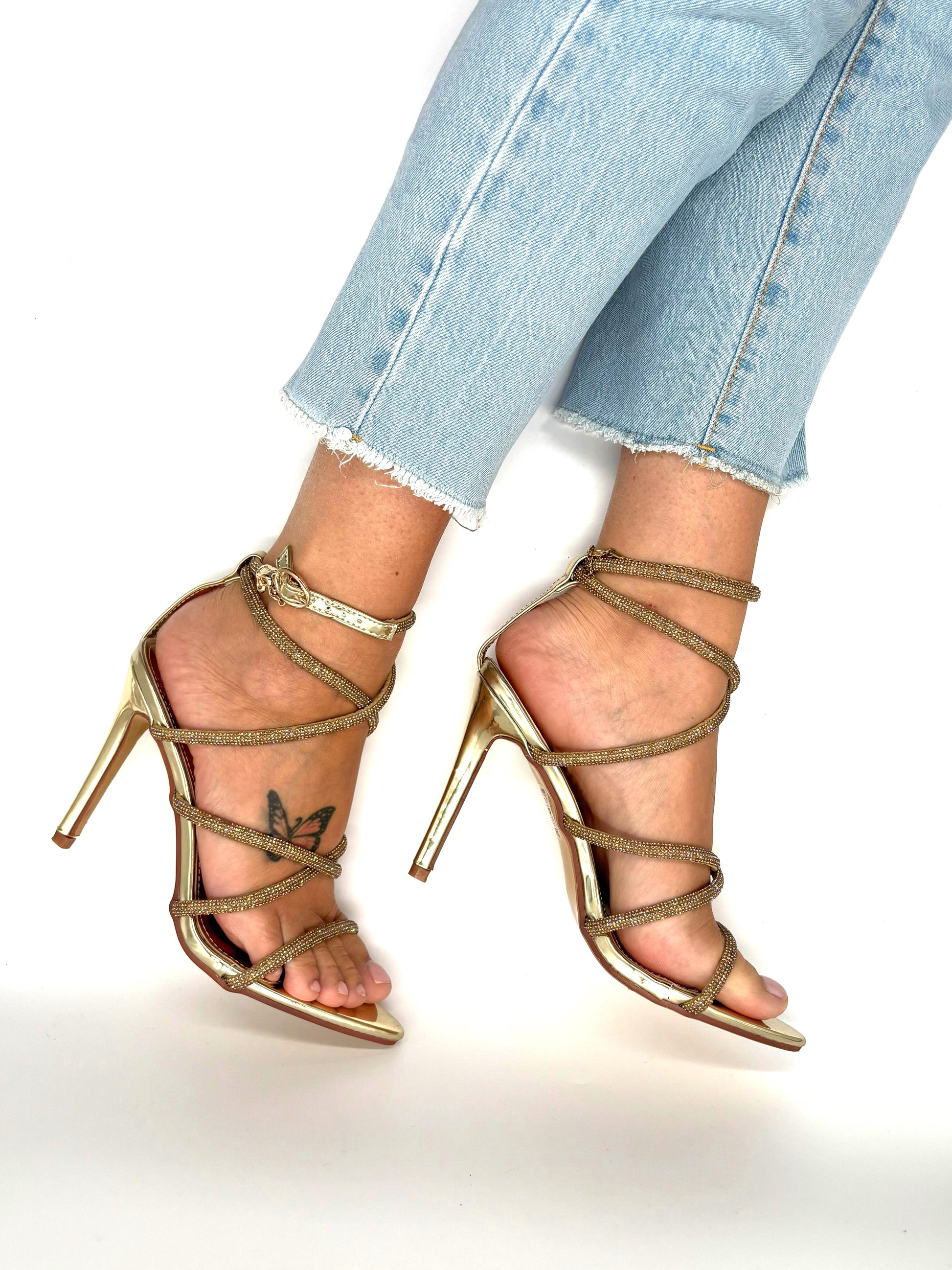 Sandalo intrecciato con strass e cinturino alla caviglia.